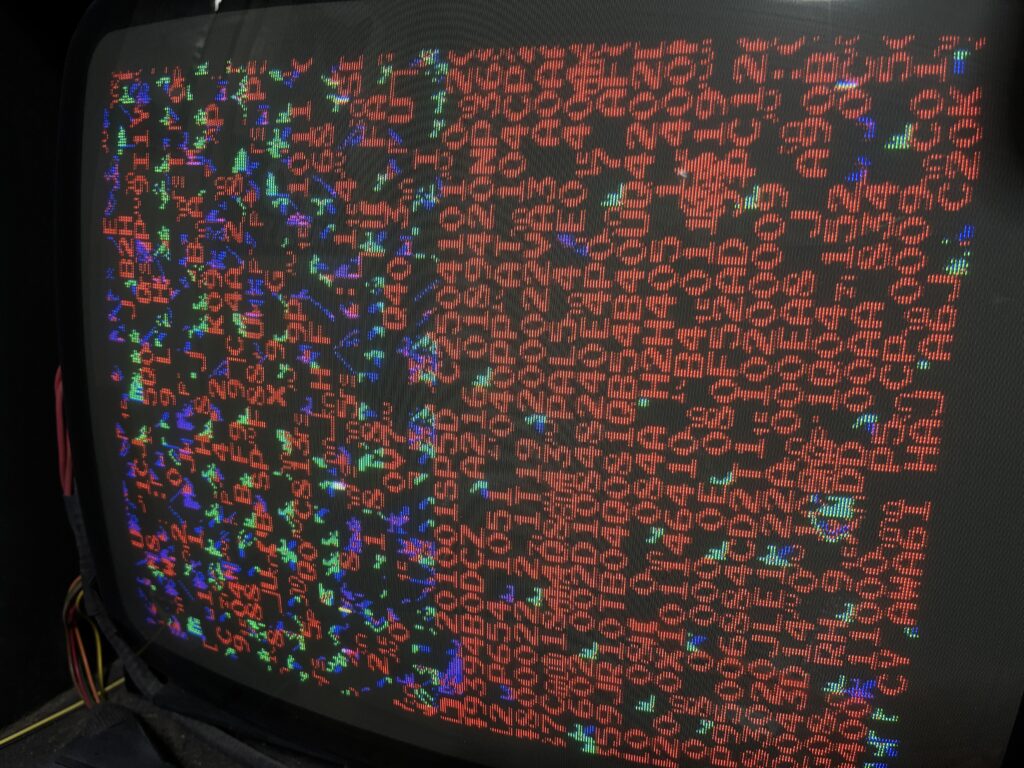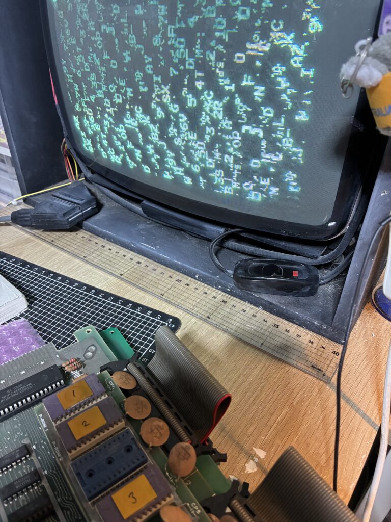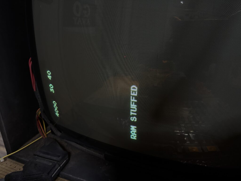 ハーネスを作って(ビデオ周りが部品面と半田面で逆だった)立ち上げるとこの画面で止まります。