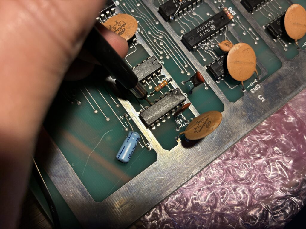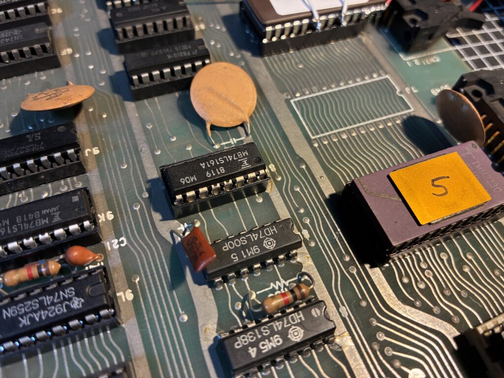 R52/R50/R49/R51の時点で音がガビガビなので、それより上流に原因があるはずです。4066は交換しても変わらず、6Tの74393はウォッチドッグ関連で交換したので、残りは9Jの74273(ソケット化されてた)と8K/9Kの74161です。