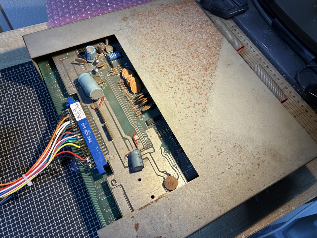『ギャラクシアン』のコピー基板には珍しく鉄のケースに入っていました。一通りの確認を行った上で、元に戻して修理完了です。